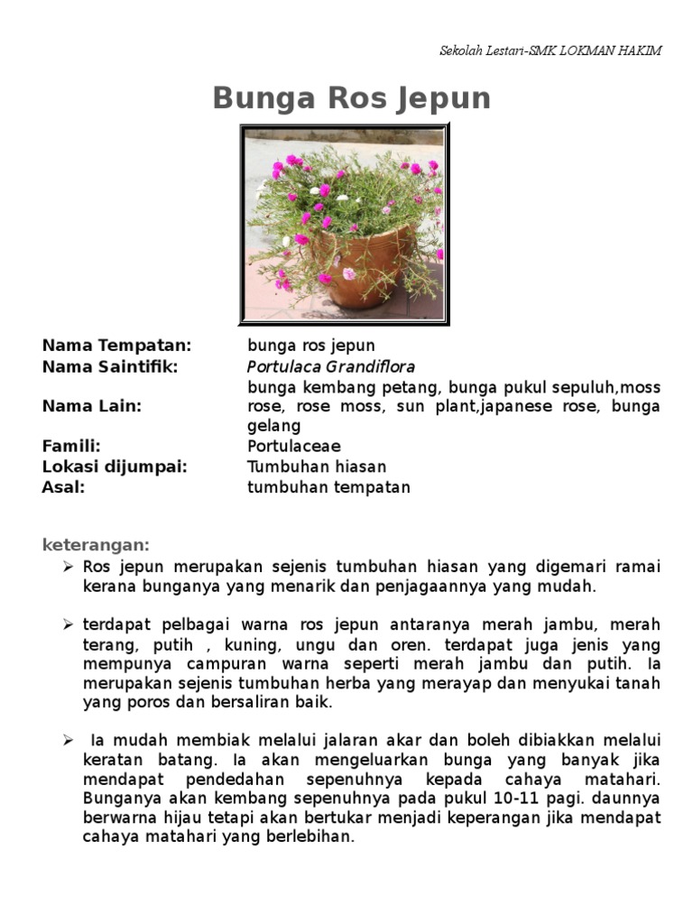 Saya sangat sukakan bau dan susunan kelopaknya yang cantik. Ros jepun merupakan sejenis tumbuhan hiasan yang digemari ramai kerana bunganya yang menarik dan penjagaannya yang mudah. Nama bunga unik yang memiliki beraneka macam warna ini didapat dari ahli botani asal swedia, anders dahl. Selain bunga bougenville ternyata zinnia juga disebut sebagai bunga kertas. Rosela, asam kumbang, asam susur, asam paya atau rosella (hibiscus sabdariffa) adalah spesies bunga yang berasal dari benua afrika.mulanya bunga yang juga cantik untuk dijadikan penghias halaman rumah itu diseduh sebagai minuman hangat di musim dingin dan minuman dingin di musim panas. Mawar ini memiliki bunga berwarna putih bersih pada bagian luar dan semu krem pada bagian. Rose dalam bahasa perancis, artinya bunga mawar. Nama bunga kertas/ zinnia flower. Nama bunga ini menjadi lambang kesopanan, kesetiaan, serta cinta yang lembut atau rapuh. Poppy, nama ini berasal dari bahasa latin yang berarti bunga merah. Ros jepun merupakan sejenis tumbuhan hiasan yang digemari ramai kerana bunganya yang menarik dan penjagaannya yang mudah. Ada bunga yang digunakan untuk menghiasi taman ataupun hiasan dan ada juga yang dijadikan sebagai hobi tanaman. Bunganya beragam warna seperti ungu, pink, merah, putih, biru bergantung kultivarnya.